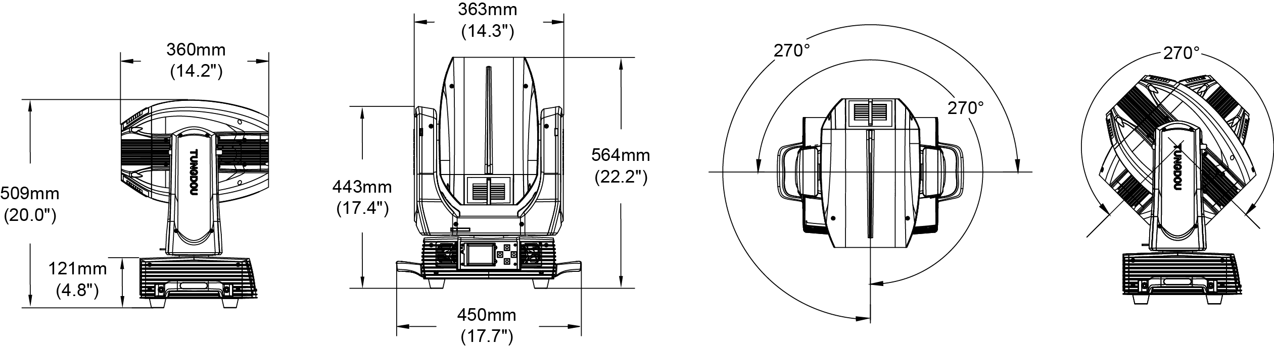 Color wheel: 14 colors + open, split color, CW/CCW rotation, variable speed
